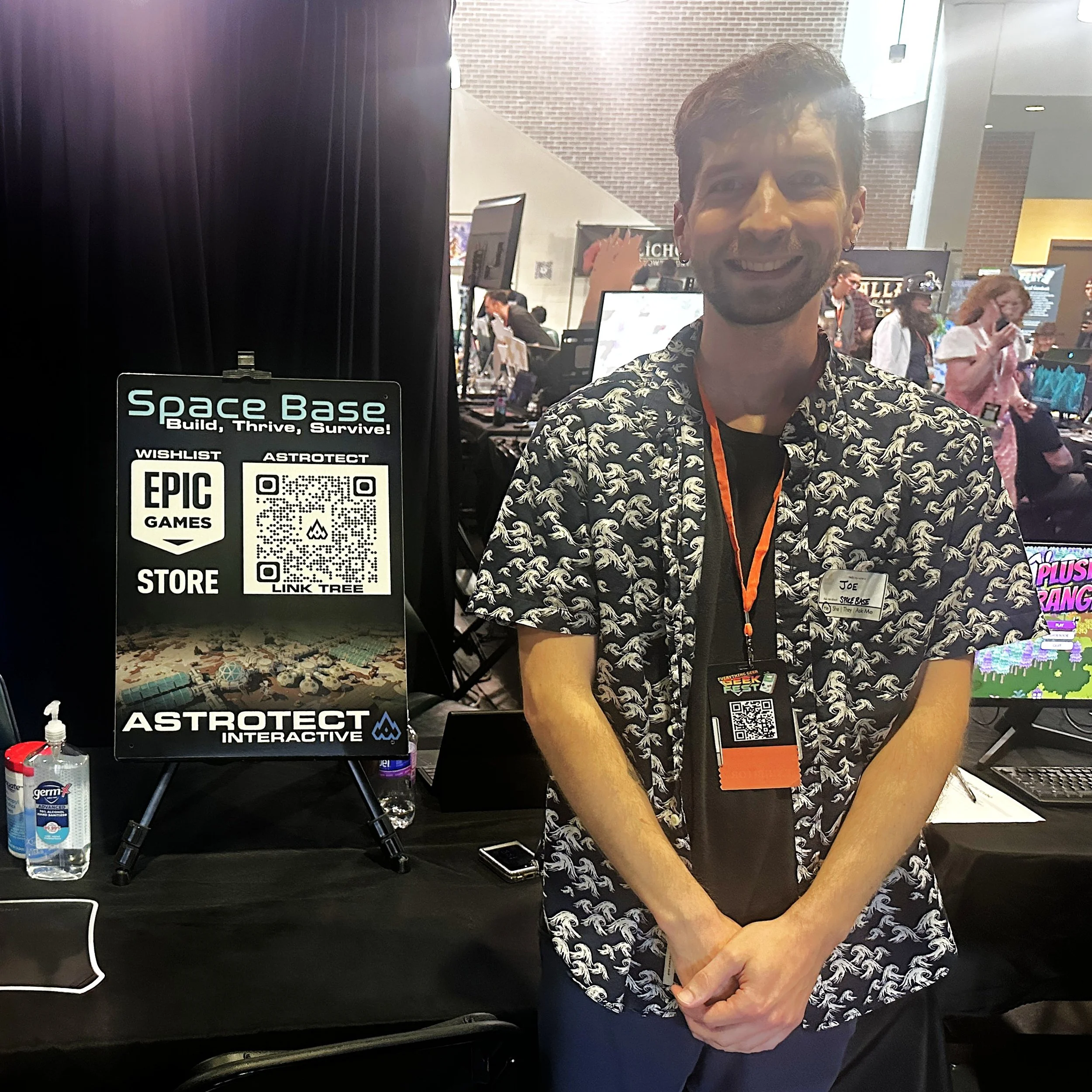 Joe: Well, I've always loved games ever since I was little, and I decided, you know, really early on, I wanted to pursue game design as a career, but it's been a little more challenging recently to make that a viable career path. I was lucky enough to get introduced to Robbie, the lead on Astrotech Interactive back at GDC, and it was actually an old professor of mine that got us connected, because we were both alumni from the same school. We just hadn't really taken any classes together. We were just co adjacent, so we didn't really meet beforehand, but it was nice to get that connection, because now I'm finally on a project, and it just feels really good to be able to use my skills first before just kind of floundering in an ocean of what do I do, and I can't get a job, you know. So feels good to be doing this now.