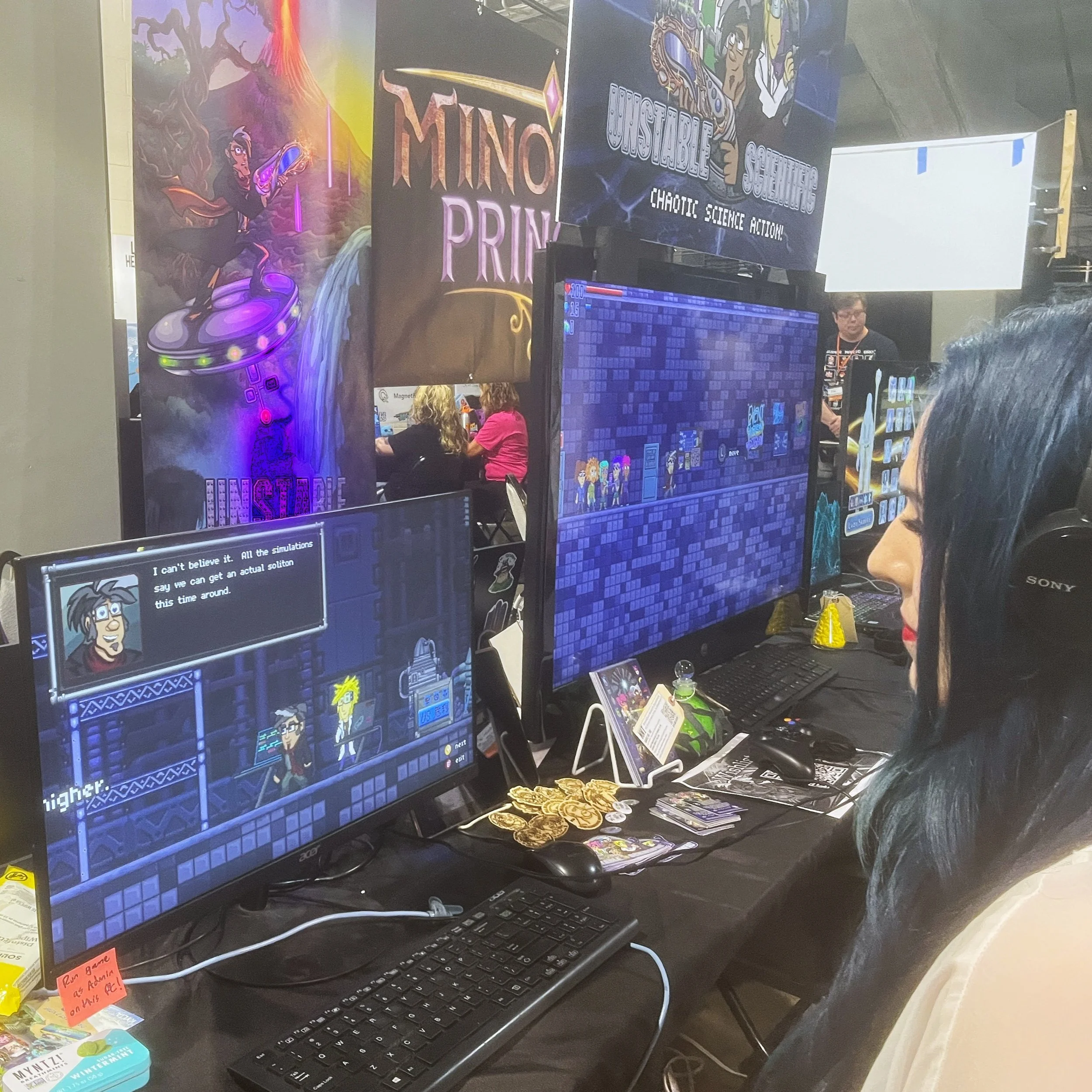 As I browsed the Seattle Indies booth at GeekFest West this year, I ran into Masha, a lovely individual wearing a lab coat and mad scientist goggles. With a getup like that, I couldn't help but want to know more about their game. As a journalist, I come across countless 2D pixel platformers and dystopian indie games, but Unstable Scientific drew me in because it somehow combines these elements with a cozy storybook vibe. My frist impression of this game was, “cozy chaos? I’m in.”